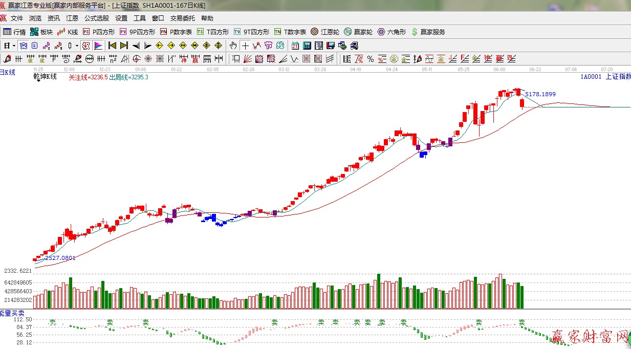 ☆依據贏家江恩理論系統能量買賣提示:有“賣”字出現,綠色能量柱,看空。