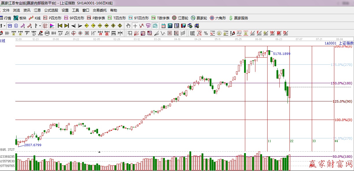 江恩看盤綜述:依據贏家江恩技術工具分析得出:生命線之下弱勢區域,藍色外軌線支撐,依據物極必反規則,今日如期反彈,大幅的反彈暫時消除了暴跌的恐慌,雖然今日觸底暴漲,但真正底部還需要時間來修復,因此反彈之后,控制好自己的倉位,為迎接最終底部做準備,操作上,中線金融股逢低繼續跟進,煤炭、有色等二線藍籌也可適當關注。