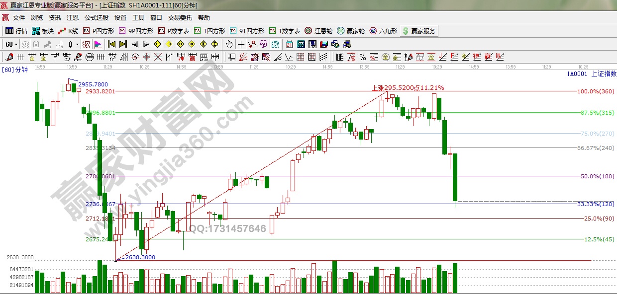 ☆ 依據(jù)贏家江恩理論系統(tǒng)江恩波段百分比線提示:周四關(guān)注短線支撐2720點(diǎn),2700點(diǎn)。阻力2785點(diǎn)點(diǎn)。