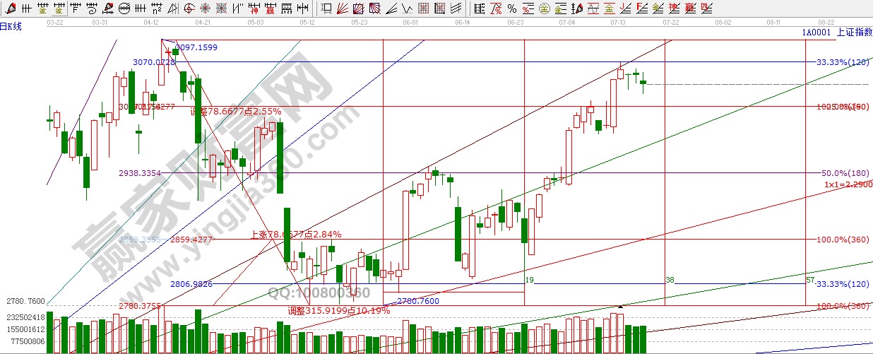 ★依據贏家江恩理論系統極反通道提示:滬指日線圍繞藍色外軌線震蕩,30分生命線是3030點附近,60分生命線是3000點附近。