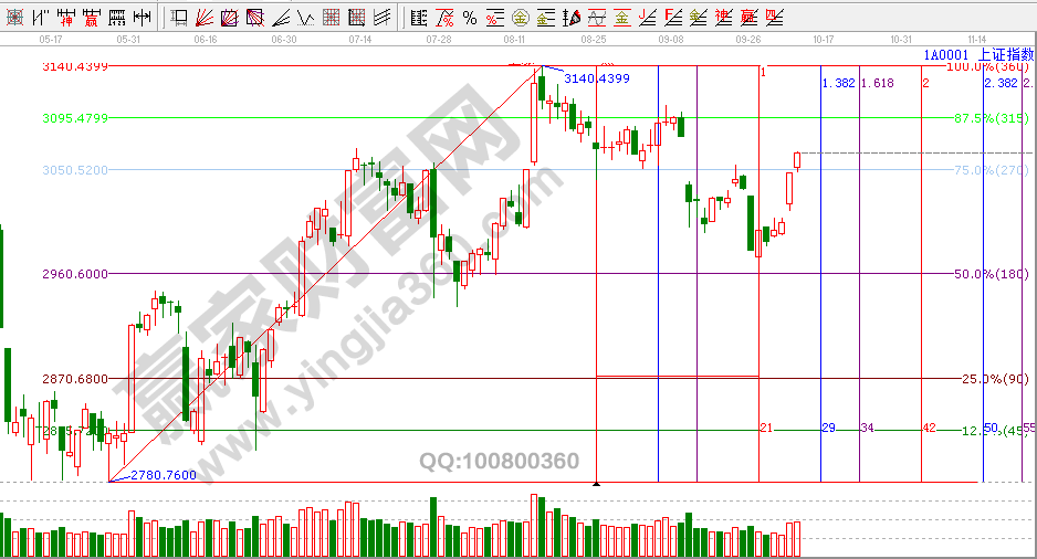 ★依據贏家江恩理論系統江恩波段百分比線提示:以2780點到3140點做波段百分線,3050點轉入支撐位,上方315度位置阻力是3095點。