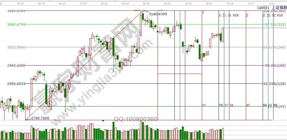 ★依據(jù)贏家江恩理論系統(tǒng)極反通道提示:滬指在60分生命線附近止跌回升,藍色外軌線是3096點。