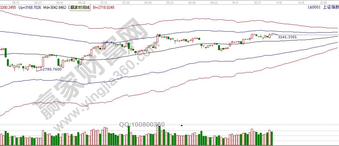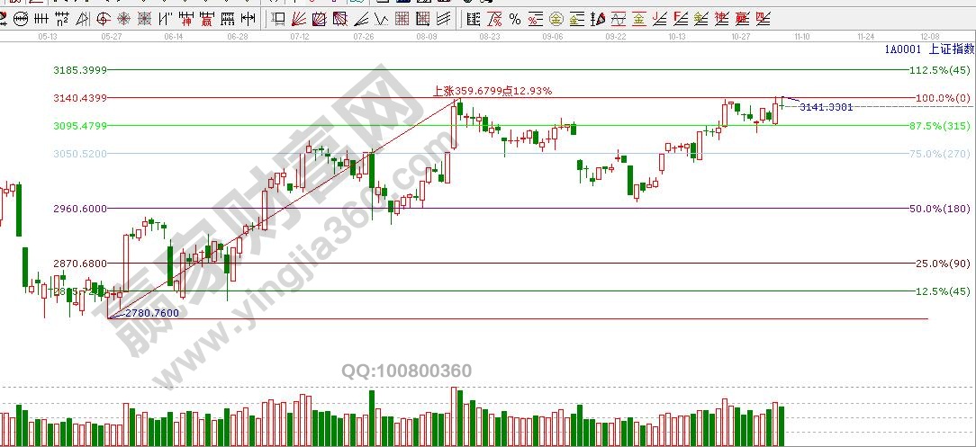 ★依據(jù)贏家江恩理論系統(tǒng)江恩波段百分比線提示:滬指支撐270度3095點(diǎn),盤中突破3140點(diǎn)新高,此位置一旦收復(fù),下一目標(biāo)位3185點(diǎn)附近。