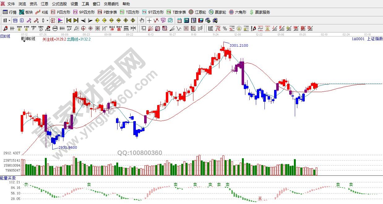 ★依據贏家江恩理論系統乾坤K線提示:滬指k線由紫色警示k線轉入紅色,出局線金叉關注線,依據規則紅色K線看多。