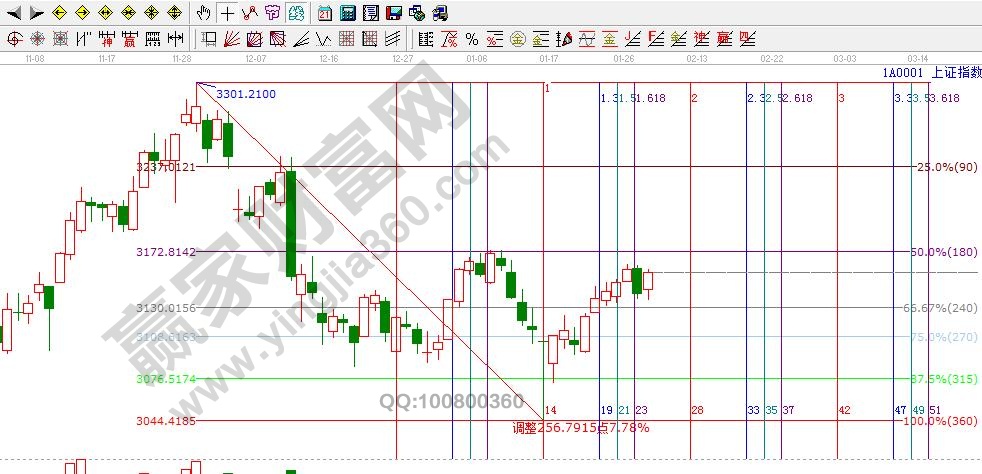 ☆依據贏家江恩理論系統江恩波段百分比線提示:滬指阻力位日線生命線3161點,180度位置3172點,下方支撐位3130點,3108點附近。