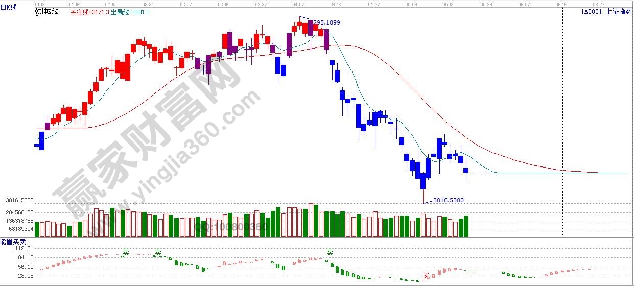 ☆依據(jù)贏家江恩理論系統(tǒng)乾坤K線提示:紅色關(guān)注線、出局線之下,藍色休息區(qū)域,依據(jù)規(guī)則,控制倉位,多看少動。