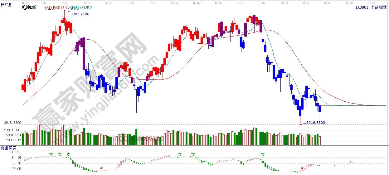 ☆依據贏家江恩理論系統乾坤K線提示:紅色關注線、出局線之下,藍色休息區域,依據規則,控制倉位,多看少動。