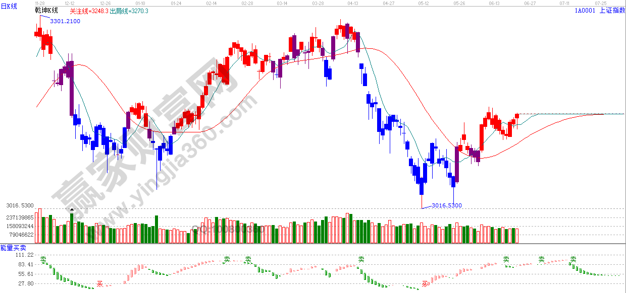 ★依據贏家江恩理論系統乾坤K線提示:紅色多頭區域,短線出局線之上,依據規則,看多。