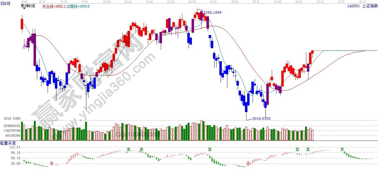 ☆依據贏家江恩理論系統能量買賣提示:“賣”字出現,紅綠柱子反復,須控制倉位。