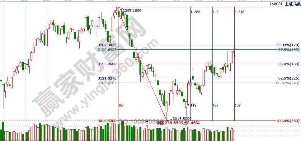 ★依據贏家江恩理論系統江恩波段百分比線提示:周二,滬指高位震蕩,向上回補3196缺口,此區間和江恩135-120度位置共振,135度-120度阻力位3190--3200區間。支撐180度3155點附近。
