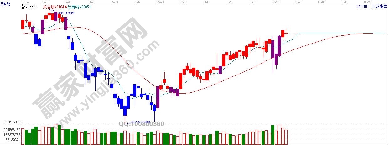 ★依據贏家江恩理論系統乾坤K線提示:紫色k線轉入紅色k線,依據規則,看多。