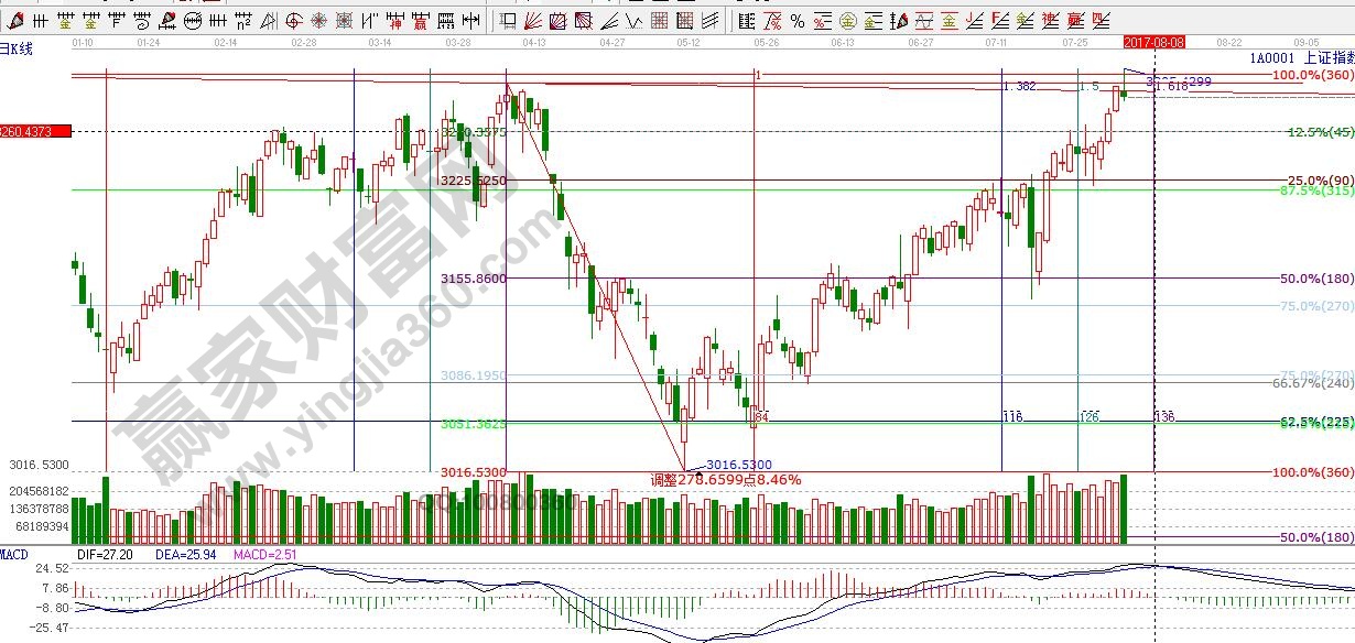 ☆依據贏家江恩理論系統江恩波段百分比線提示:滬指延續強勢,創出新高后回落,支撐位45度附近3260點。