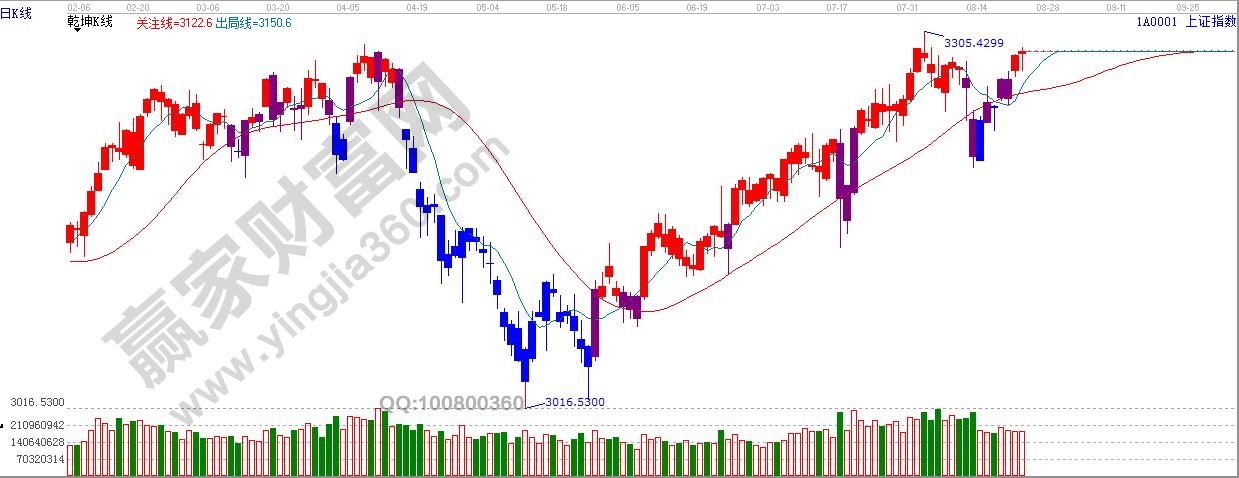 ★依據(jù)贏家江恩理論系統(tǒng)乾坤K線提示:滬指由紫色k線,轉(zhuǎn)變?yōu)榧t色k線,進入多頭區(qū)域,依據(jù)規(guī)則,看多。