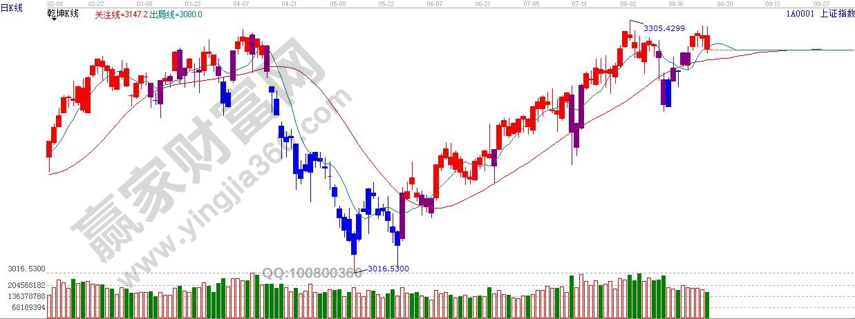 ★依據贏家江恩理論系統乾坤K線提示:滬指由紫色k線,轉變為紅色k線,進入多頭區域,依據規則,看多。