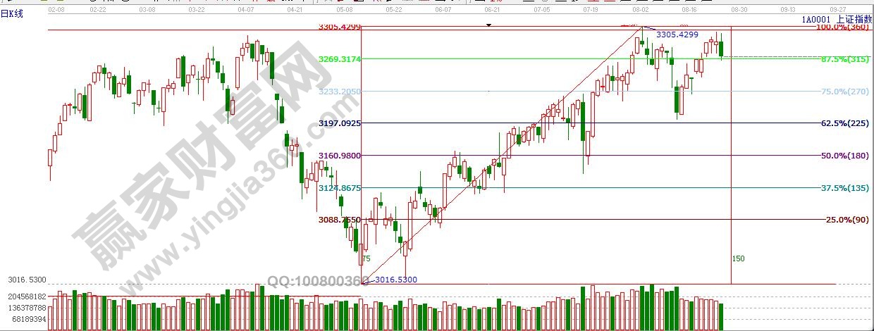 ☆依據贏家江恩理論系統江恩波段百分比線提示:滬指進一步向上試探3300點附近,展開回落,支撐關注3260點,3233點附近。