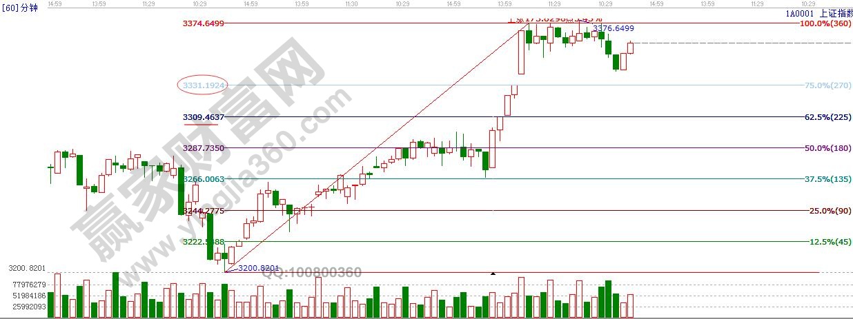 ☆依據贏家江恩理論系統江恩波段百分比線提示:滬指繼續在3380點下方整理,盤中回踩3340點,下方支撐270度3330點附近,225度3309點附近,短期阻力位是3380點附近。