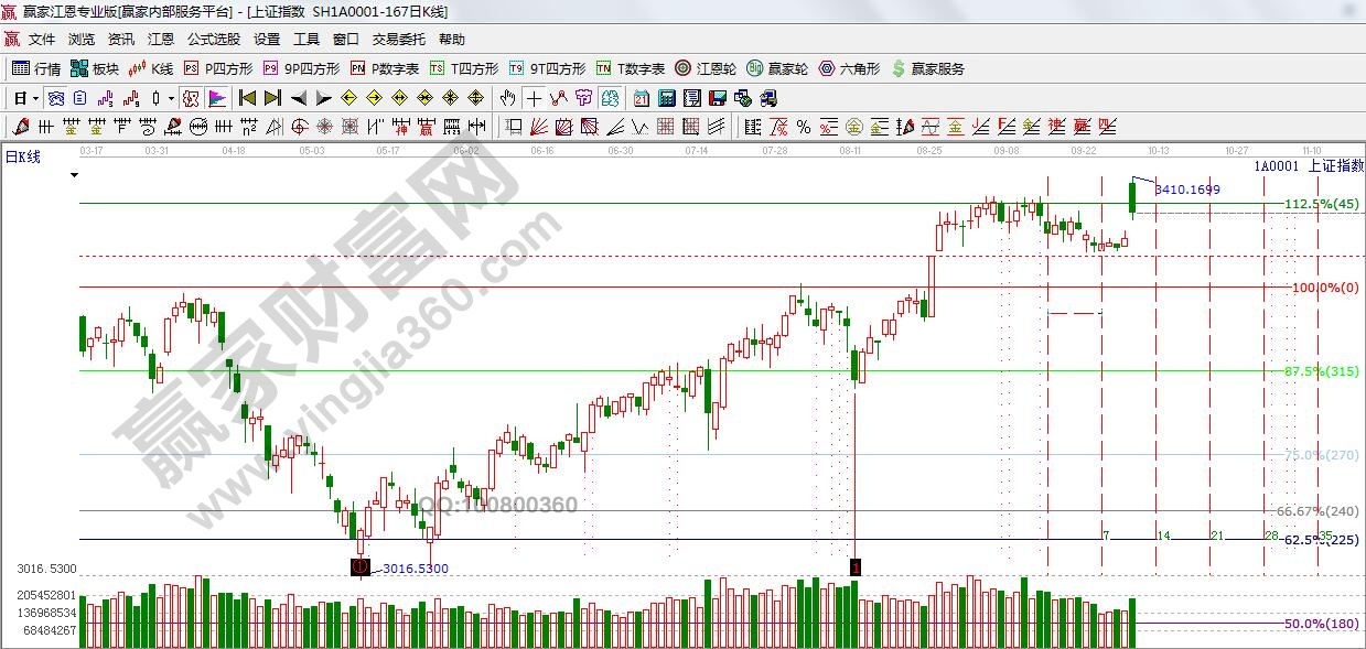 江恩看盤綜述:依據贏家江恩技術工具分析得出:周一,兩市大幅高開,節中積攢的大量利好,得到集中釋放。滬指日線直接達到極反通道藍色線,隨后震蕩回落,但仍保持跳空上漲態勢。極反藍色線3419點,預計短期高位震蕩或回踩60分生命線3357點支撐為主,繼續暴漲的概率不大。整體以震蕩慢牛結構行情為主。接下來題材股或將輪番表現,操作上,關注三季報概念。