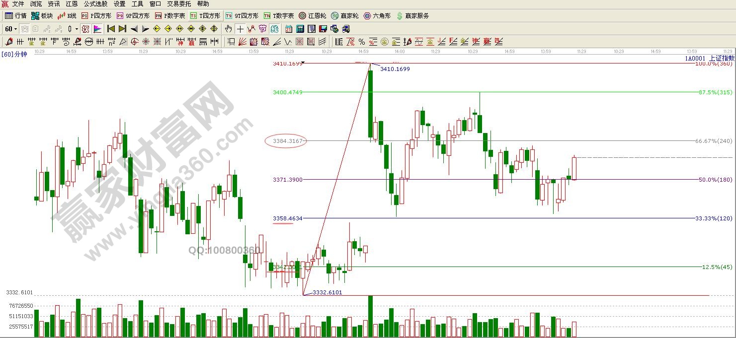 ☆依據贏家江恩理論系統江恩波段百分比提示:短周期阻力3384點,支撐是3357點,以及45度線3340點附近。