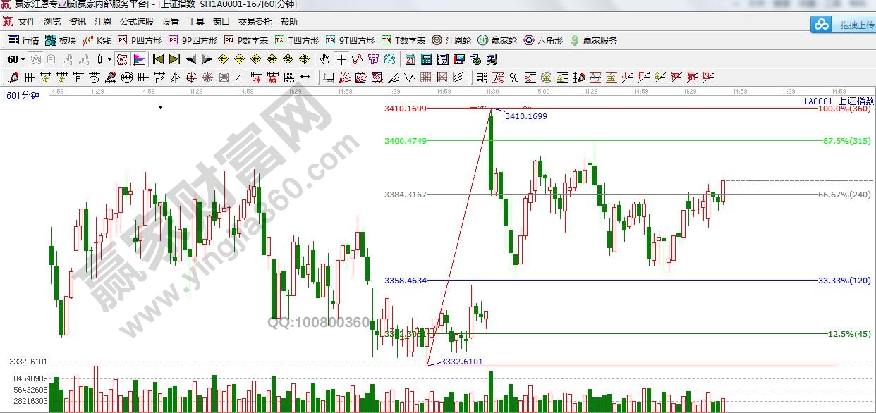 ☆依據贏家江恩理論系統江恩波段百分比提示:滬指收復3384點,轉為支撐位,如此位置回踩不破,下一目標位是3410附近,破位將再次關注支撐是3357點,以及45度線3340點附近。,