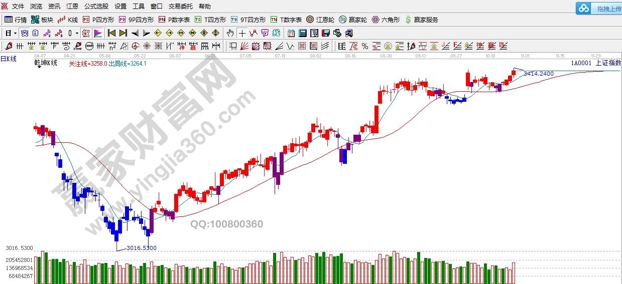 ★依據贏家江恩理論系統乾坤K線提示:k線由紫色轉入紅色k線,依據規則,關注線之上,紅色可操作區域,看多。