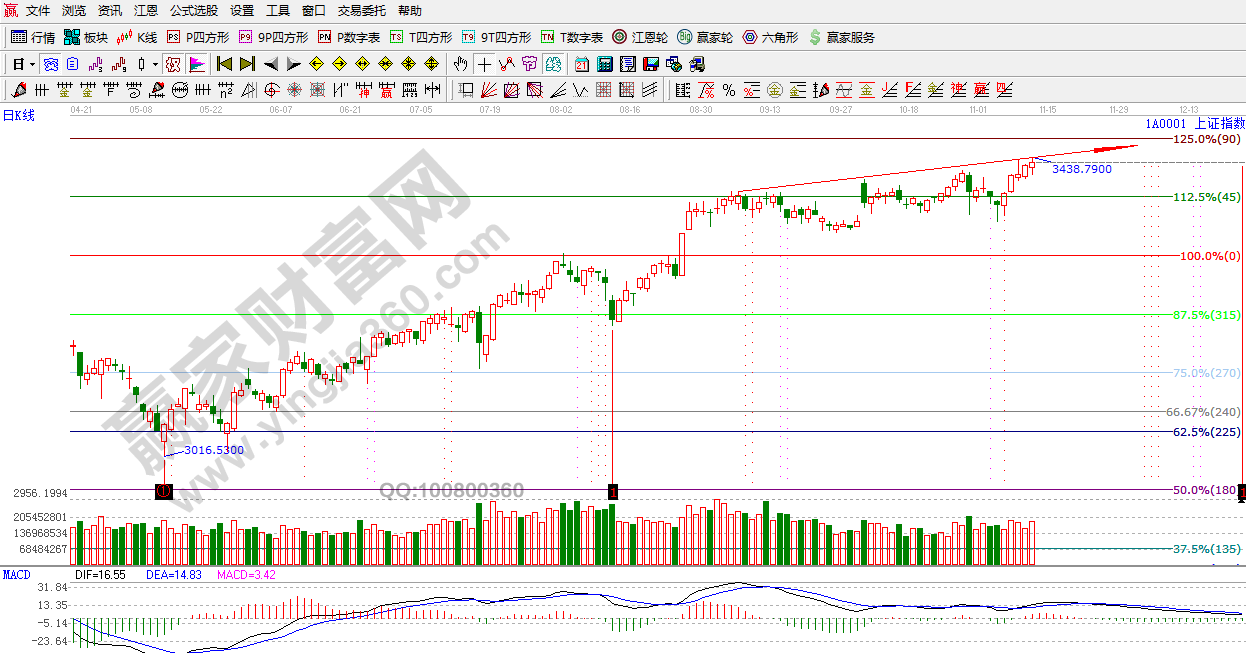 ☆依據贏家江恩理論系統江恩波段百分比提示:滬指突破前期高點3420點,此價位轉變為支撐,45度線價格是3385點附近。目標阻力在90度線3466點附近。