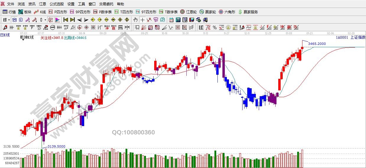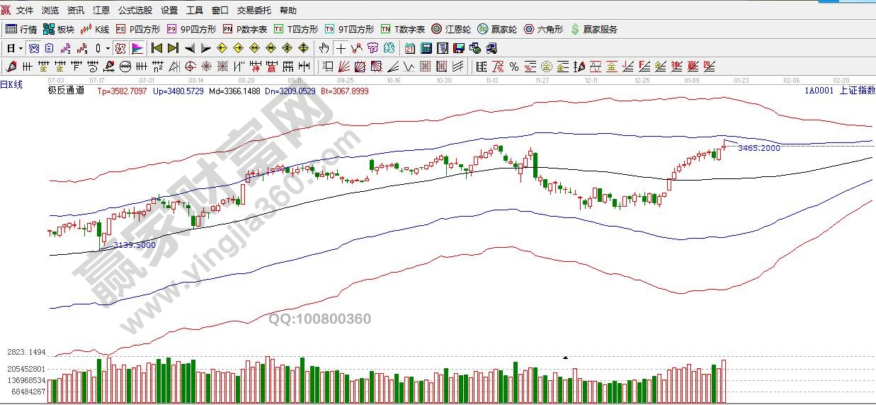 江恩看盤(pán)綜述:依據(jù)贏家江恩技術(shù)工具分析得出:周三,滬指再次強(qiáng)勢(shì)上攻,突破前期高點(diǎn)再創(chuàng)新高。并觸及極反通道日線藍(lán)色外軌線,依據(jù)規(guī)則,藍(lán)色外軌線短期會(huì)有一定的拋壓,短期需注意沖高回落以及震蕩的情況出現(xiàn)。藍(lán)色線阻力是3475點(diǎn)附近,支撐關(guān)注百分比270度3412點(diǎn)附近,下一時(shí)間窗口是1.22日附近。操作上,回避近期漲高的藍(lán)籌,關(guān)注調(diào)整過(guò)后的低位業(yè)績(jī)不錯(cuò)的標(biāo)的。