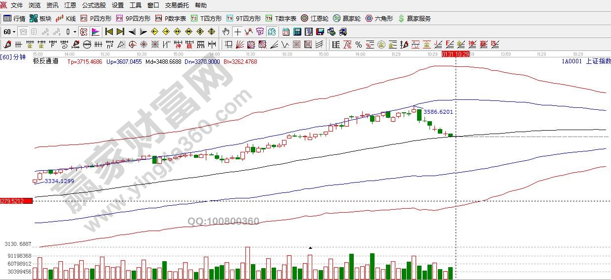 ★依據贏家江恩理論系統極反通道提示:滬指繼續低開低走,跌破日線藍色上軌線3500點關口,一路下探至60分生命線3488點附近,短期繼續關注此位置的爭奪。