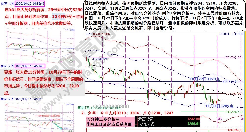 在本周周報預測分析中,已經給出11月重要時間節點。強調日線時間拐點未到,按照預期將延續震蕩。11月2日盤前預期的日內支撐3204、3210,壓力3238、3247。實則,11月2日最低點3209.9,最高點3242,指數在預期的空間內標準震蕩。江恩對于支撐阻力研判的精準性,在提前預測與實際點位的對比中鑒證。