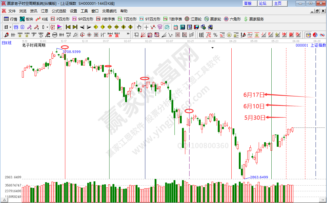 依據老子時間數列所揭示的時間密碼:滬指未來次級別時間窗口為6月10日、6月17日。