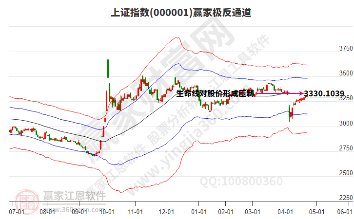 ☆依據(jù)贏家江恩極反通道趨勢(shì)工具展示:指數(shù)自4月7日上漲至極反通道生命線下,按照贏家規(guī)則,生命線作為趨勢(shì)的強(qiáng)勢(shì)啟動(dòng)點(diǎn),生命線下整體視為看空。