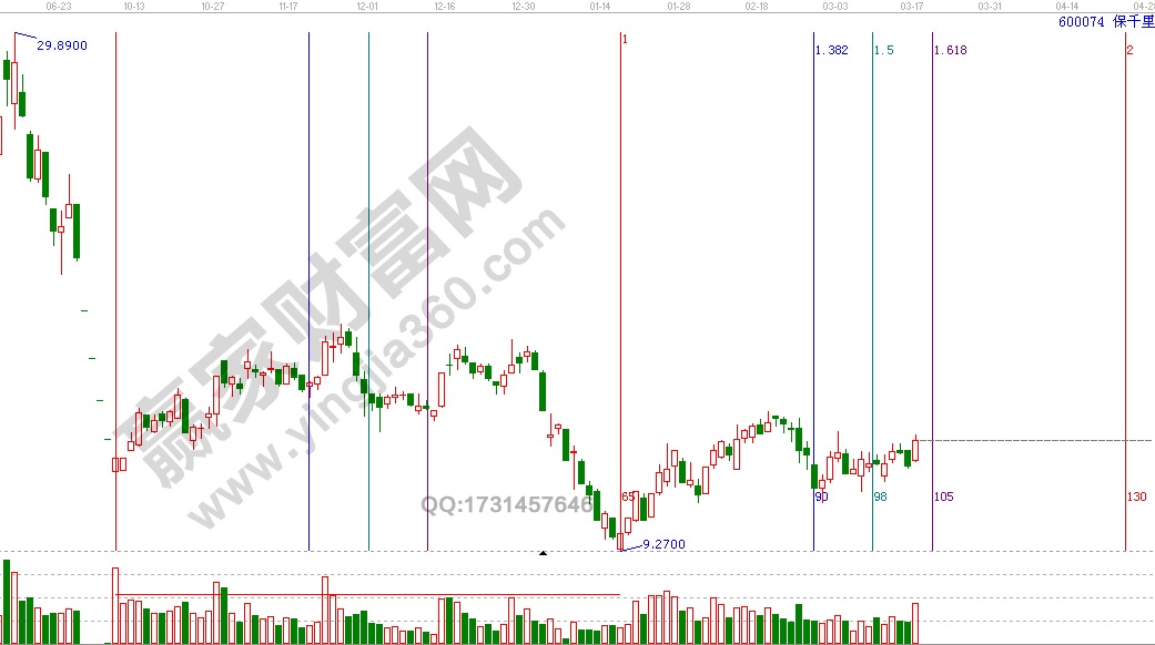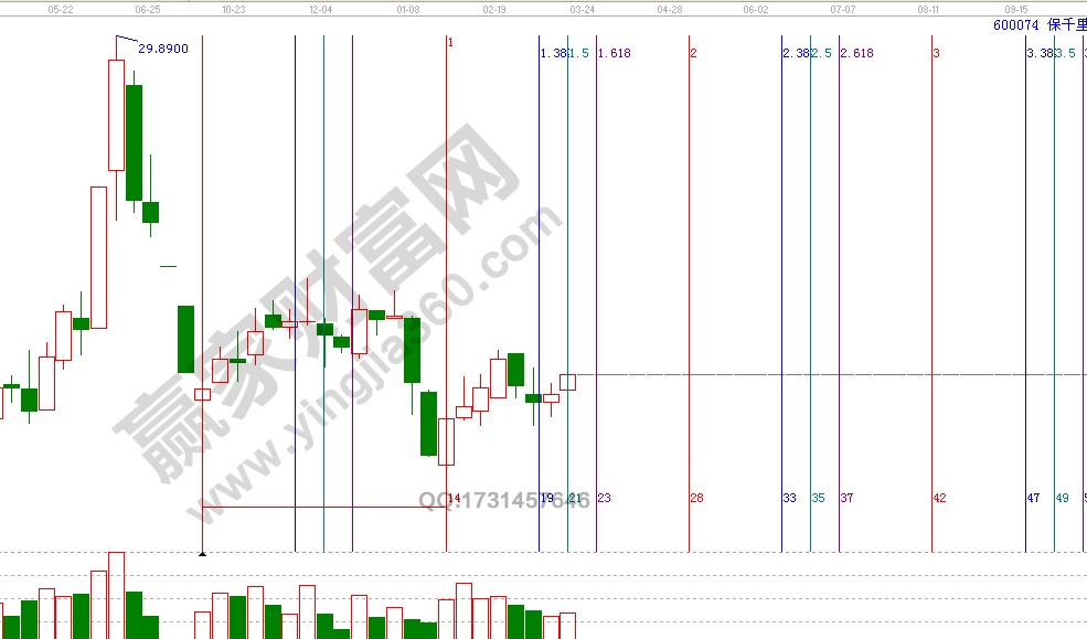 3、個(gè)股月線處于頂部和底部我I起點(diǎn)的角度線上的位置和在時(shí)間周期中的位置。