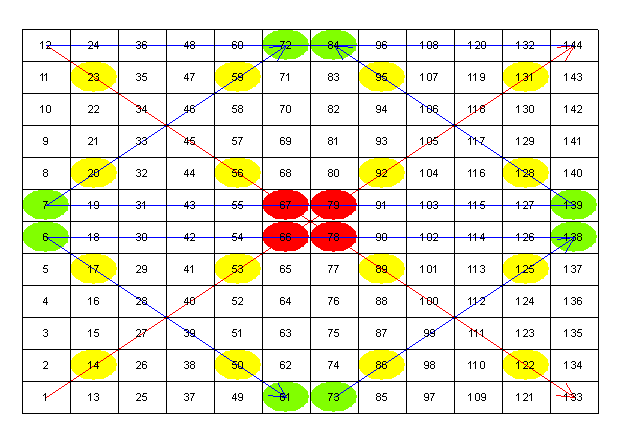另外,請記住,任何東西從起點移動3段的時候,它到達它自身位置的平方,這是第一個強阻力。當它移動6段就到達相反位置,即等于它自身位置的一半,遇到更強的阻力。從自身位置移動9個位置或段,它就到達3/4點,另一個平方。第8、9段是最強和最難通過的點,這是死亡區域。下一個更強的是結束于144的第12段或第12列。任何東西到達這一點遇到最強阻力。但是,一旦它移到這個正方形外,進入第2個正方形里3個點,也就是147,將顯示更強。但是,在到達這點以后,它將不再回到141,即第1正方形里3個點。