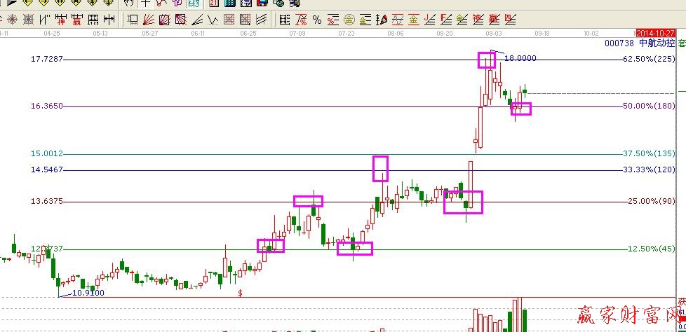 江恩價(jià)格百分比,起點(diǎn)為10.91元,分析000738這只股。從圖中可以看出,重要的高低點(diǎn)都在百分比重要的分割位置上,比如,45度位置,120度位置,180度位置等,這就是說,如果你提前把握住這些重要位置上的點(diǎn)位,那你就能比其他人搶先一步知道股票的支撐以及阻力,這樣的話,你是不是就能更好的來把握買點(diǎn)以及賣點(diǎn)了呢?根據(jù)圖可以看出,目前是有百分比180度位置的支撐,價(jià)格是16.35元附近,我們說股價(jià)就像爬樓梯一樣,爬上一個(gè)臺(tái)階,在上另一個(gè)臺(tái)階,看百分比的方法也是一樣的,股價(jià)站穩(wěn)了一線,就看高一線,如果一線沒有突破,就向下看一線。因此,目前該股的目標(biāo)是17.72元附近。