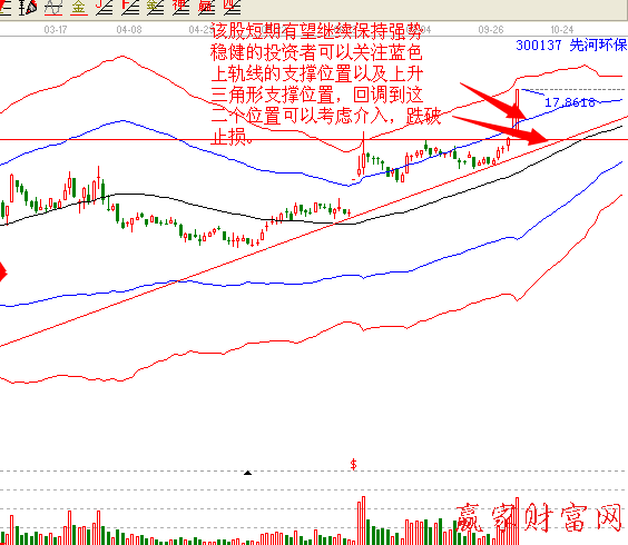 2,技術面上:今日成功突破近期反彈高位,上漲趨勢形成,短期有望延續強勢。后勢如遇回調到藍色上軌線止跌,短線可以考慮介入,如果跌破藍色上軌線就要注意風險了,做好止盈止損的準備。后市需要密切關注主力動向,早期主力已經獲利豐厚,一旦發現主力大幅出逃,說明主力開始出貨,就要果斷止盈。