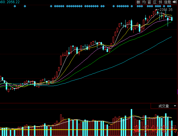 技術分析:依據贏家江恩系統極反通道提示,昨日試圖嘗試突破極反通道藍色上軌線未果,從圖中可以看到大盤已經三天受到藍色上軌線的壓制,今日再次跳水,短期建議空倉觀望,下方支撐2290附近。
