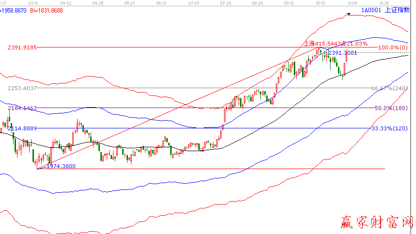 技術分析:從技術面來看,滬指自觸底2279點后迅速企穩回升,短短3個交易日內反彈幅度達到100點左右,短線反彈空間或已一步到位。目前大盤運行到前期頂部高點附近,面臨巨額套牢盤拋壓,短線抄底進場的獲利盤也有較大回吐壓力,后市大盤恐將進入橫盤整理階段。從圖中可以出到,目前大盤已經穩占極反通道上軌線,市場人氣開始恢復,結合今日的量能來看,后市很有可能突破2391點,后市如果向上突破壓力位在2410附近。