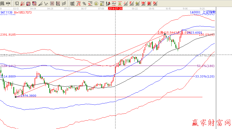 從技術面來看,滬深兩市股指連拉4連陽之后,多頭目前已完全占據主導優勢,但做多動能的迅速釋放恐將透支后市行情,短線股指繼續大幅上漲的空間或已不大,后市大盤繼續上攻在2400點關口附近也有震蕩整理的需求。同時從江恩極反通道可以看出大盤今日已近運行到藍色中軌線,預計下周很可能沖高回落。