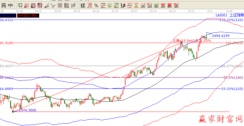 技術面看,昨日大盤收出帶長下引的倒T字K線,其實已經提示了風險,在加上今天大盤盤中無量突破進二年的最高點2444點而今日沖高回弱留下長上引線更是明顯的提示了短期頭部的到來,今日沖高有誘多的嫌疑,而在此下跌則繼續考驗2400點支撐位的作用,近期調整仍將繼續,但仍然無法抵擋跨年度行情的走勢。故繼續介意多看少動,保住勝利的果實。依據贏家江恩系統極反通道提示,今日突破藍色上軌線沒有成功,可以理解為假突破后市調整將繼續,調整先看2400點和2319點的支撐。