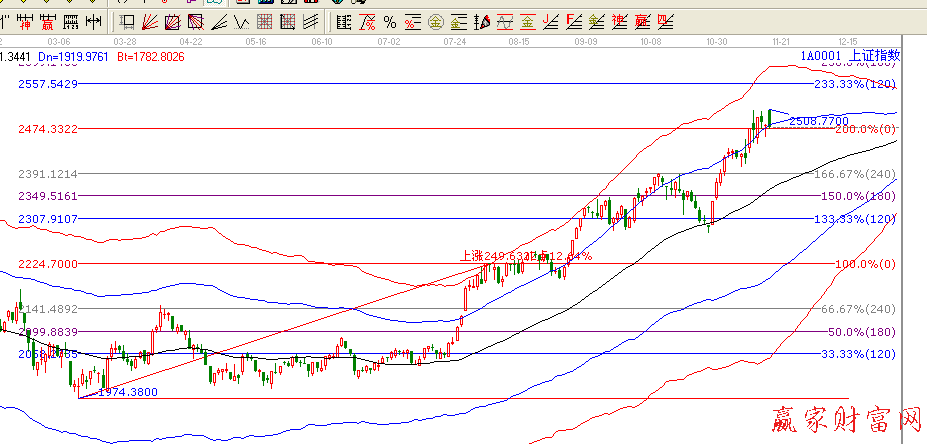 技術(shù)分析:依據(jù)贏家江恩系統(tǒng)極反通道提示,今日大盤收盤已經(jīng)跌破藍色上軌線,一旦明無法收復,大盤短期可能進入頭部區(qū)間,后市來看大盤不容樂觀,明日關(guān)注支撐點位2444點和2465點附近。