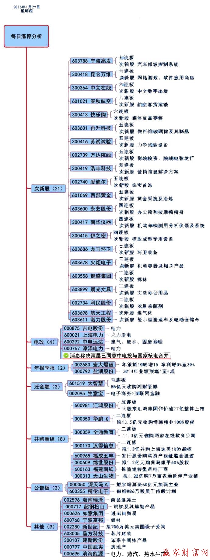 漲停原因揭秘:備受關注的中電投和國家核電合并事宜,已在近日獲得最高決策層簽字通過,目前國資委正在制定具體方案,近期官方將對外宣布兩大巨頭合并方案。受此影響,實控人或者控股股東為中國電力投資集團公司的吉電股份、上海電力、中電遠達,第二大股東為中國電力投資集團公司的漳澤電力今日漲停。
