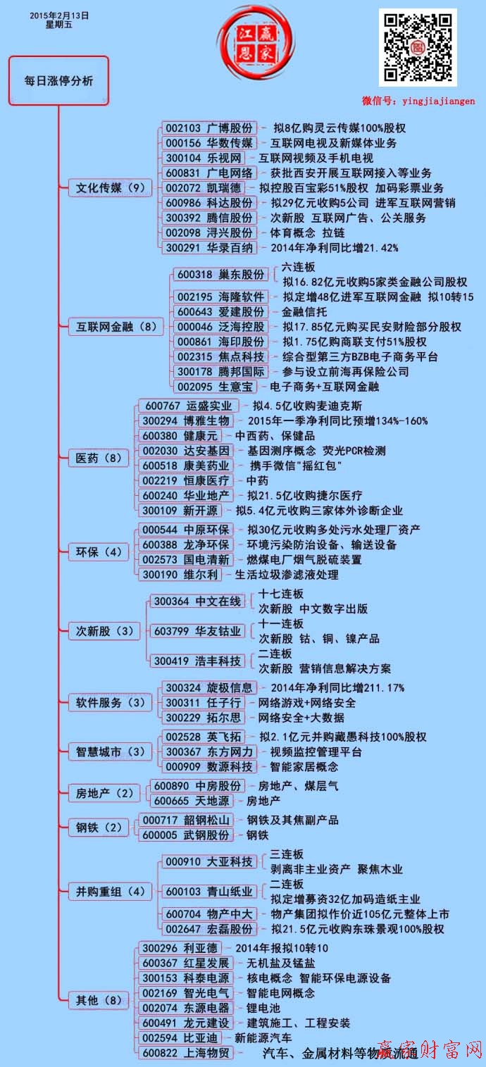 今日滬深兩市早盤大幅高開,在打新解凍資金和央行放水的利好刺激下,大盤一路上行,表現的相當強勢。但午后出現一波跳水行情,截止收盤漲幅收窄。從盤面上看,P2P、脫硫脫硝、智能電視表現搶眼,均大漲3%以上;兩市只有券商一個行業板塊下跌。截止收盤,共有54只個股漲停。以下將對部分股票漲停原因進行分析: