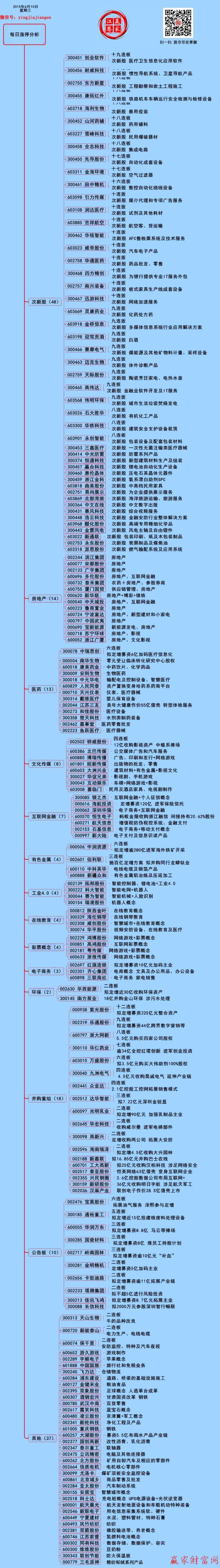 盤面上看,次新股、文化傳媒、全息技術、3D打印、網絡游戲等板塊漲幅靠前,交運設備、風能、海工裝備、機械、鐵路基建、中字頭、核電、煤炭等板塊跌幅領先。另外,全天有近180只非ST股漲停。今日上市的8只新股中國核電等均達漲幅上限。中國中車今日再度大幅下挫,跌幅逾9%。以下將對部分股票漲停原因進行分析:
