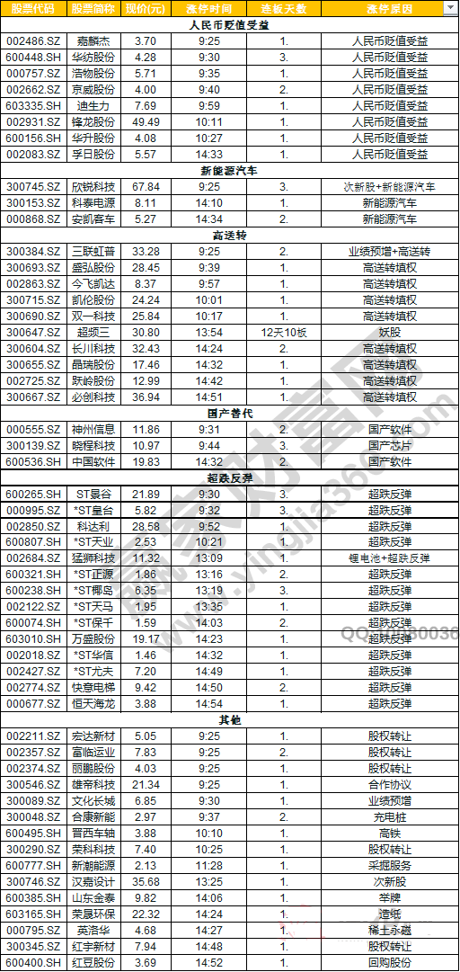 1、受益人民幣貶值,紡織制造板塊連續上漲,龍頭華紡股份三連板,華升股份漲停,孚日股份大漲超9%。