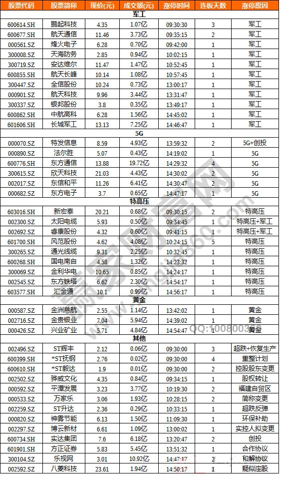 盤面上,5G板塊午后異動拉升,法爾勝(000890)、東信和平(002017)等多股漲停;軍工板塊全線爆發,航天通信(600677)、航天長峰(600855)、長城軍工(601606)、烽火電子(000561)等多股集體漲停;新疆火炬(603080)、鵬鷂環保(300664)開盤跌停,昨日公告部分股東擬清倉式減持;COMEX 2月黃金期貨創18年6月份以來收盤新高,受此消息影響,黃金板塊快速拉升,金貴銀業(002716)、金洲慈航(000587)先后漲停。