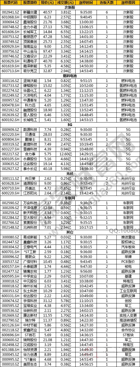 盤面上,午后次新股上演漲停潮,新疆交建(002941)收獲六連板,愛朋醫療(300753)、金力永磁(300748)等十余股漲停;燃料電池板塊午后異動,龍頭中通客車(000957)直線封板;工信部部長苗圩稱今年將發放5G臨時牌照,受此消息影響,5G開盤活躍,貝通信(603220)一字板,鵬博士(600804)、雪峰科技(603227)等多股漲停;光伏板塊延續強勢,江蘇陽光(600220)、清源股份(603628)等多股漲停。