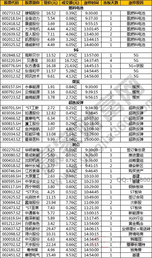 盤面上,周期股有所表現(xiàn),鋼鐵、煤炭板塊較為強(qiáng)勢(shì),西寧特鋼(600117)、云煤能源(600792)等多只周期股漲停;燃料電池板塊表現(xiàn)強(qiáng)勢(shì),雄韜股份(002733)、大洋電機(jī)(002249)等多股漲停;5G板塊午后集體走強(qiáng),東方通信(600776)、貝通信(603220)、高斯貝爾(002848)接連漲停;次新板塊高開低走,多只個(gè)股振幅較大,新疆交建(002941)、愛朋醫(yī)療(300753)上演天地板。