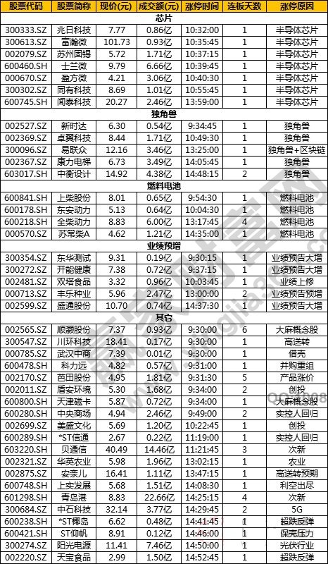 盤面上,午后創投板塊集體回暖,民豐特紙(600235)一度直線封板,弘業股份(600128)、德美化工(002054)多股拉升;獨角獸板塊再度走強,新華文軒(601811)、卓翼科技(002369)等多股集體封板;半導體板塊持續回暖,富瀚微(300613)、士蘭微(600460)等多股漲停;工業大麻板塊異動,龍頭順灝股份(002565)六連一字板,天津磁卡(600800)反包漲停。