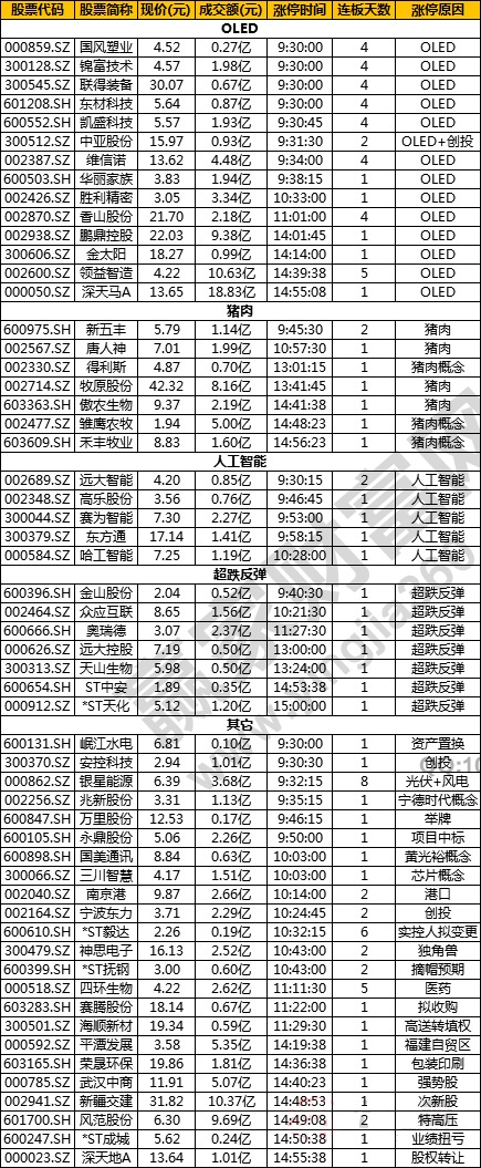 盤面上,養(yǎng)豬板塊午后持續(xù)拉升,雛鷹農牧(002477)、得利斯(002330)、牧原股份(002714)等多股集體封板;柔性屏概念股分化,凱盛科技(600552)、維信諾(002387)、聯(lián)得裝備(300545)、國風塑業(yè)(000859)等個股持續(xù)封板,激智科技(300566)、同興達(002845)、華映科技(000536)等紛紛走弱;石墨烯板塊早盤活躍,錦富技術(300128)、華麗家族(600503)雙雙漲停;東方通信(600776)盤中漲停,帶動5G板塊走強,貝通信(603220)一度大漲8%。