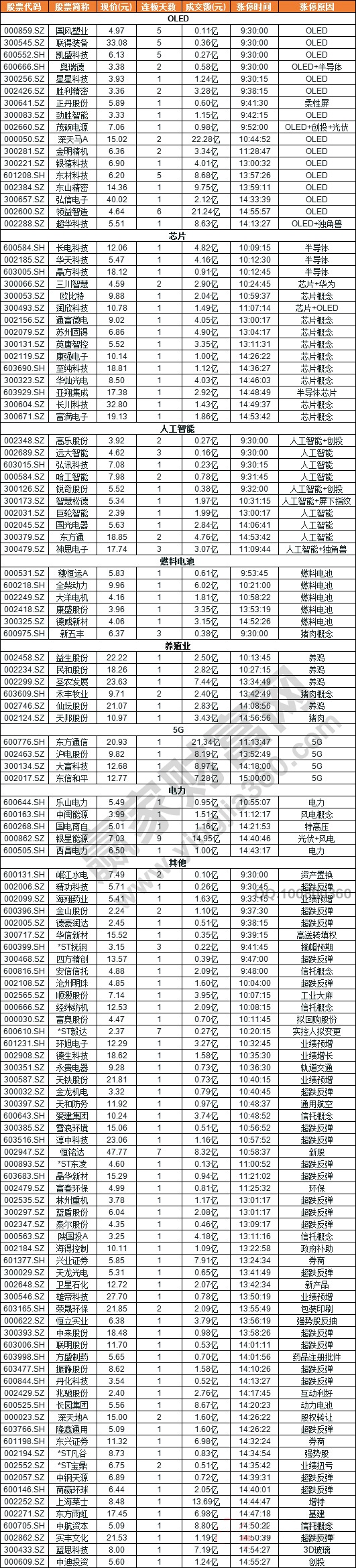 盤面上,券商板塊午后再度發力,興業證券、東興證券漲停,天風證券(601162)等多股走強;柔性屏板塊開盤分化,國風塑業(000859)、錦富技術(300128)、聯得裝備(300545)等繼續漲停,而香山股份(002870)、彩虹股份(600707)、領益智造(002600)早盤一度殺跌;豬肉概念股持續走強,新五豐(600975)繼續漲停,益生股份(002458)、牧原股份(002714)、天邦股份(002124)等個股亦跟隨上漲;芯片板塊異動拉升,長電科技(600584)領漲,華天科技(002185)、通富微電(002156)漲停,晶方科技(603005)、士蘭微(600460)等個股集體拉升。