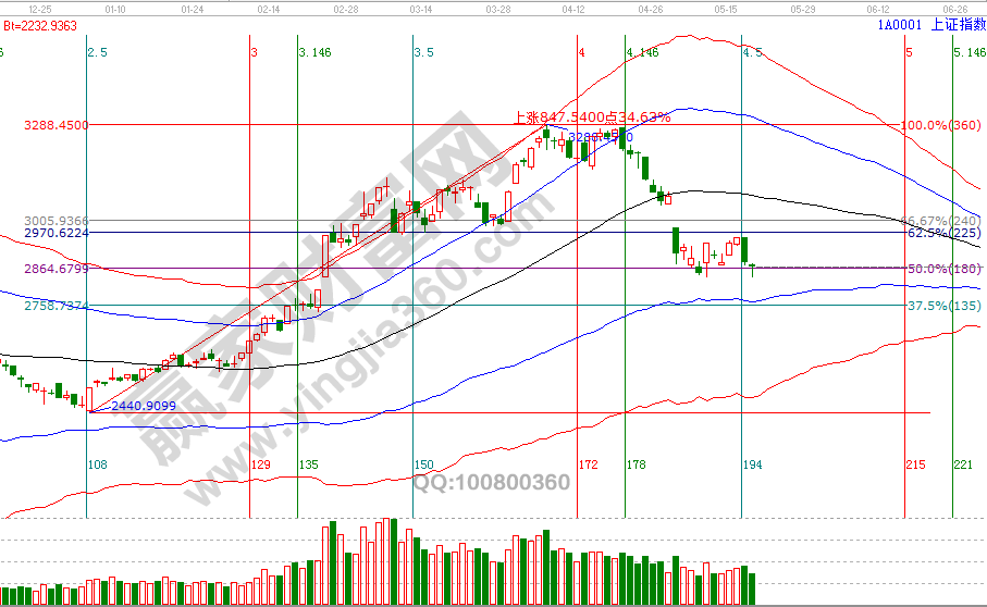 5月除9號至17號時間窗口有一次操作機會外,判斷的本月還會有一次布局機會,從空間波段百分比1倍循環(huán)二分位2834點與極反通道藍色下軌線(詳見工具)是參考區(qū)間,贏家江恩系統(tǒng)時間周期方面,本周短周期重要時間窗口是23號,日線時間窗口是28(29)號。通過系統(tǒng)工具預判方法得出參考空間與時間后,投資者要做的就是跟隨市場并做出應對策略,并且預判此區(qū)間展開的反彈要強于第一波,具體空間與時間會在系統(tǒng)VIP學員公布。21號盤中壓力是90度2894點、135度2870點,盤中支撐是315度2844點、270度2829點。操作策略,指數(shù)擊破黑色生命線進入弱勢區(qū)域,高風險者倉3成,低風險者本周進入備戰(zhàn)等待信號。